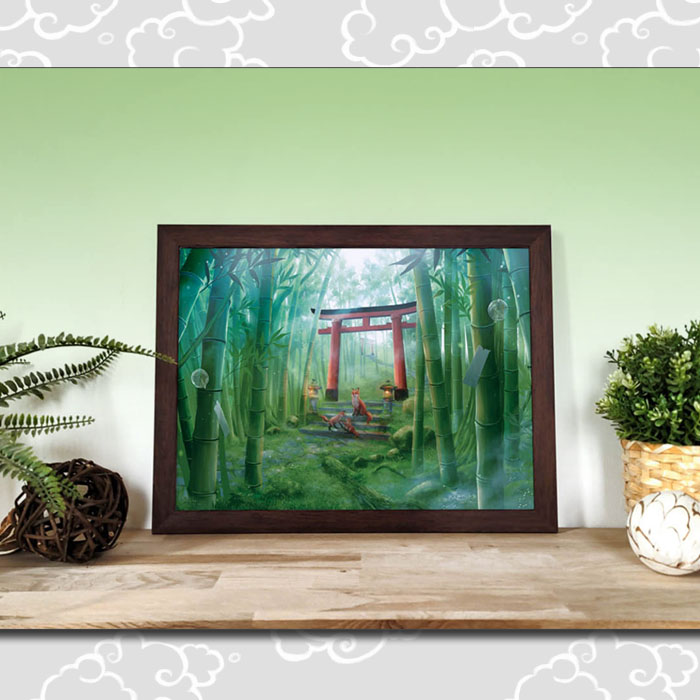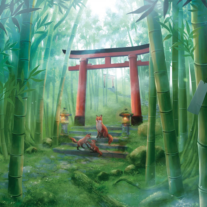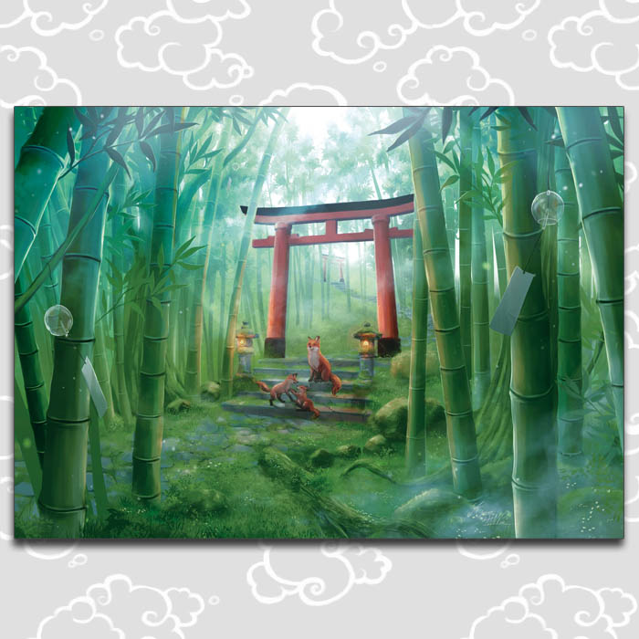 Illustration grand format d’une maman renarde et de des petits jouants dans une forêt de bambous au Japon. Une légère brise fait tinter les carillons.