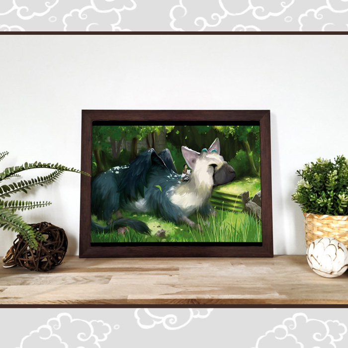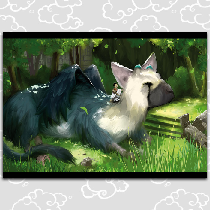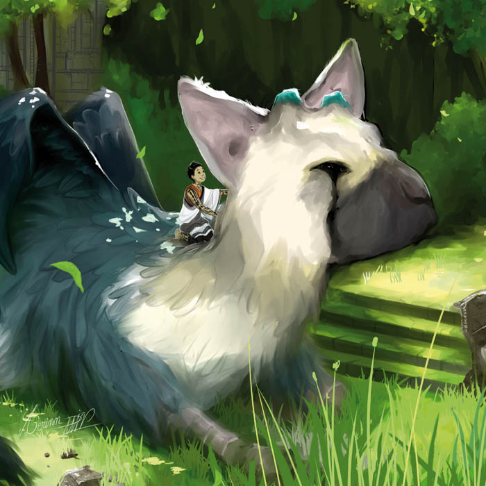 Illustration grand format de Trico et l’enfant qui se détendent dans les arbres
